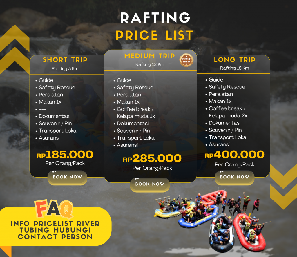 Bale Bambu Adventure menyediakan beberapa paket arung jeram (rafting) diantaranya short trip, medium trip, dan long trip dengan jeram grade 2-3. Start dapat dimulai dari Bale Bambu ataupun dari Leuwih Bilik dan berakhir di Sungapan untuk short trip dan di Leuwih Munding atau Leuwih Kuya Sodong untuk Long trip. Semua paket yang kami sediakan memiliki harga yang terjangkau.
